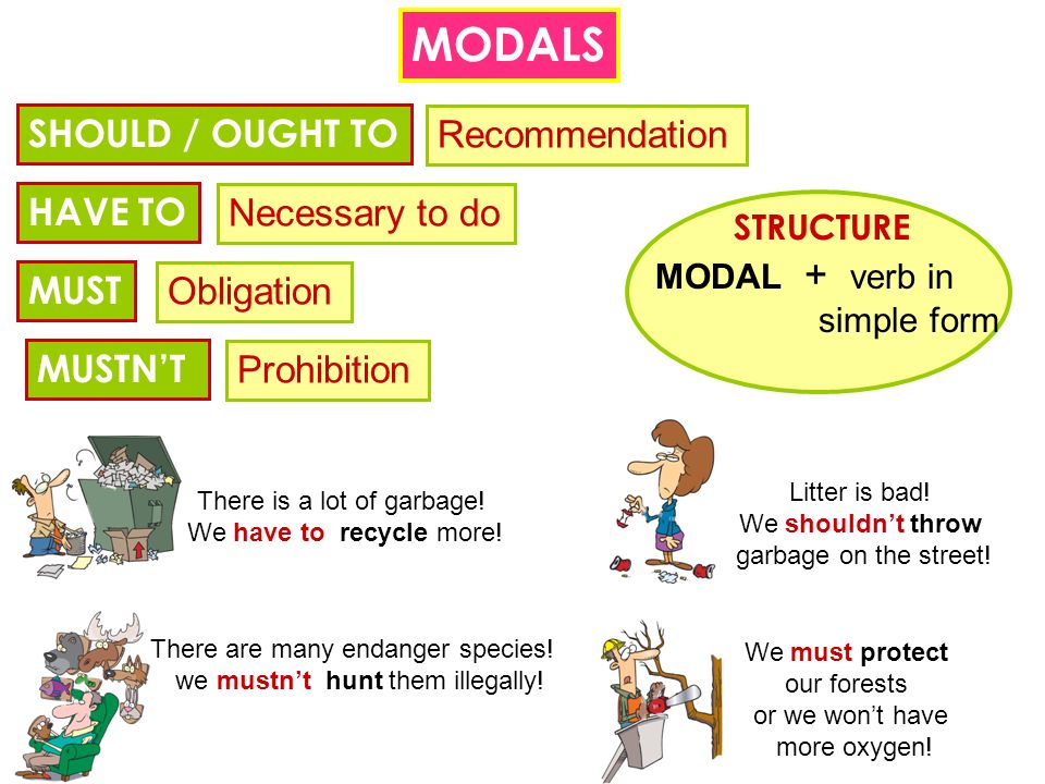 Modal Verbs: Modal verbs are a very important part of the English language. Modal verbs are used with other verbs to express various things like obligation, prohibition and advice. here we have some of them: